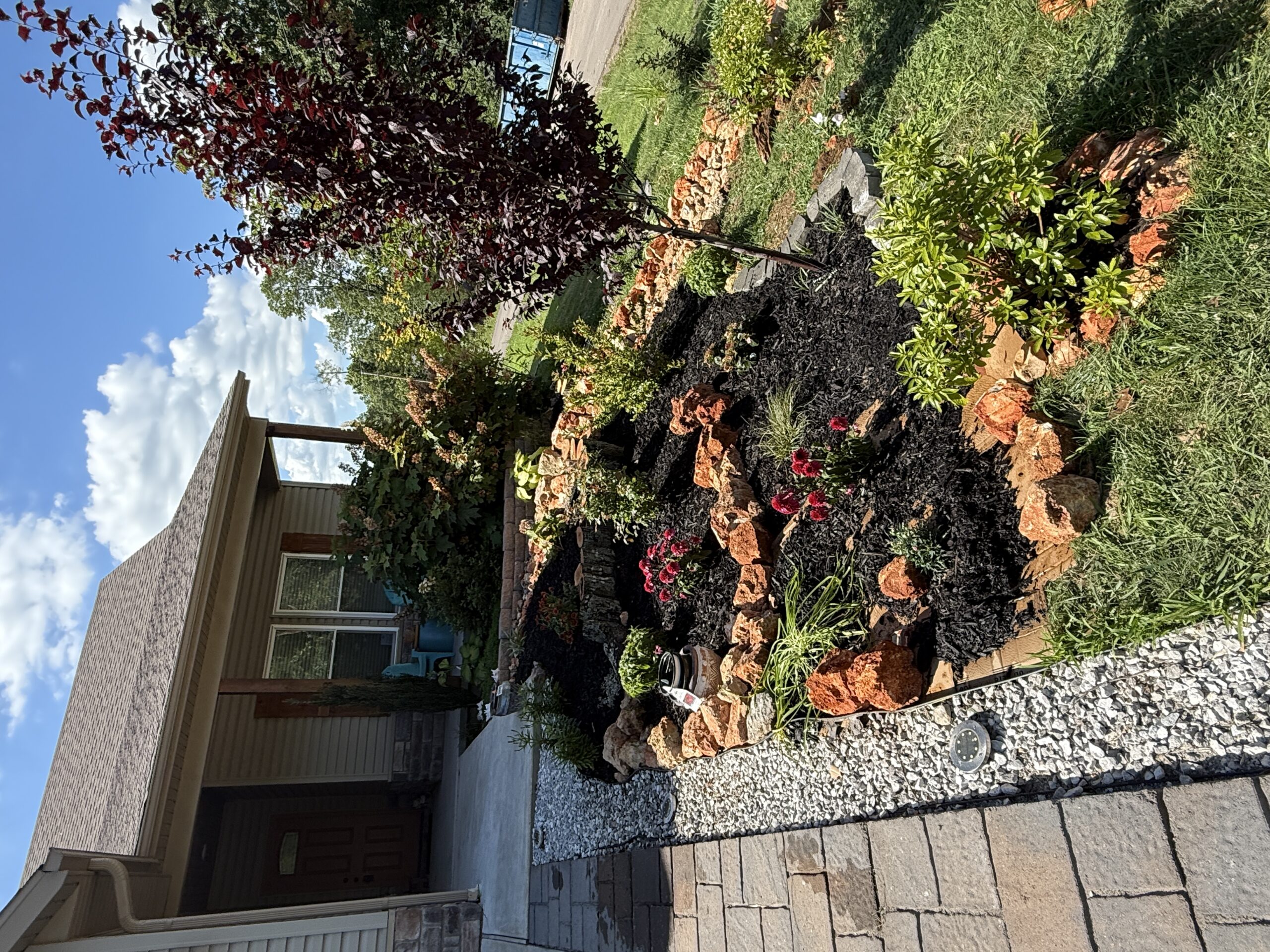 Now that I finally got my dry creek bed, next on the list is to terrace the front yard. It’s a pretty steep slope and I despise mowing it (which is really what started all of this…) but it’s going to need sections so the mulch doesn’t just get washed away. Fun fact: paving stones are expensive so I got some chunks of log from a friend who had a tree fall down in their yard and used that instead. By the time it rots away the plants will be large enough to keep the mulch on the hill anyway!